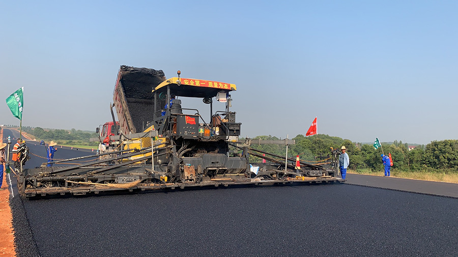攤鋪機(jī)、壓路機(jī)等設(shè)備緊張有序運(yùn)行,高達(dá)170℃的瀝青混合料炙烤著公路人
